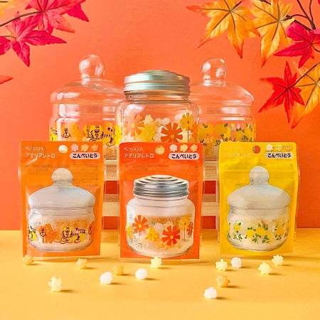 昭和レトロな可愛さが人気の「アデリアレトロのボンボン入れ」と、昔から愛され続けている小さくて愛らしい見た目の「こんぺいとう」の世界観がマッチするのでは、という発想から実現したコラボ企画。2024年4月に春をテーマにした第1弾、2024年7月に夏をテーマにした第2弾を発売し大変ご好評いただき、この度秋をテーマにした第3弾を発売する運びとなりました。