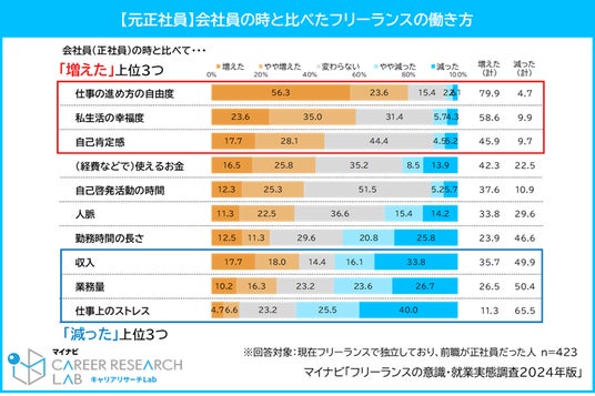 今回、元会社員(正社員)で現在フリーランスとして独立している人の実態を調査することで、会社員時代より「仕事の自由度」「私生活の幸福度」などが増える傾向にあり、フリーランスとして働くことの満足度は6割超と高い水準であることがわかりました。企業の正社員においても副業が解禁されるなど、働き方の多様化が進むなか、フリーランスは今後さらに身近な選択肢となるかもしれません。