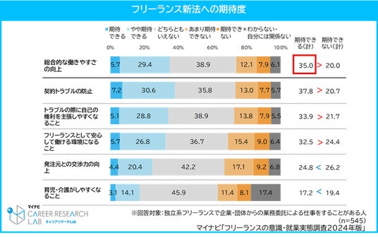 フリーランスとして独立し、企業・団体から業務委託をされている人に「フリーランス新法※2」について期待感を聞いたところ、35.0%が「フリーランスとしての働きやすさの向上(総合的に)」に期待できると回答した。また、要素別では「契約トラブルの防止(37.8%)」に期待できるという回答が最も多かった。