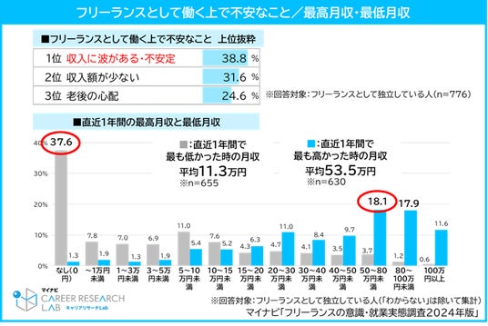 ◆フリーランスとして働く上での不安は「収入の不安定さ(38.8%)」が最多。直近1年間の最高月収は平均53.5万円、最低月収は平均11.3万円と収入に波がある結果に【図4、5】