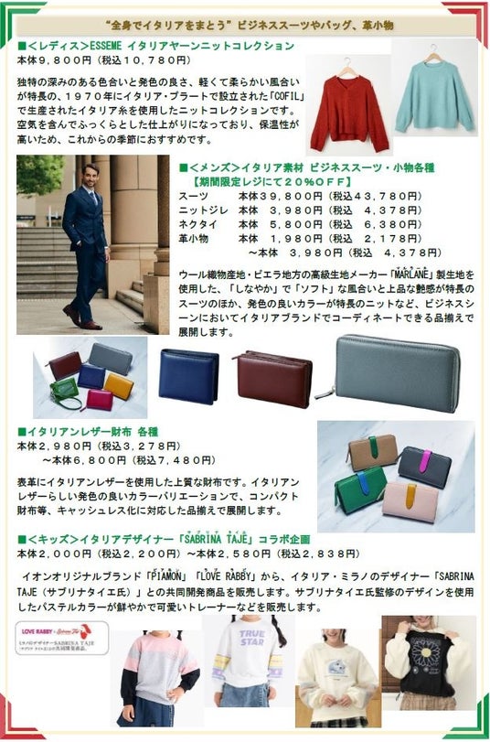 イオンリテールは今春に、イタリア貿易促進機構とイタリア政府の特別事業「GDOプロジェクト」を締結し、食品部門の直輸入拡大に取り組んでいます。今年のフェアではこうした直輸入食品をはじめ、イオンオリジナル開発商品や衣料品、暮らしの品など、イタリアの魅力をお伝えする、過去最多の362品目※1を取り揃え、イオン史上最大規模で展開します。