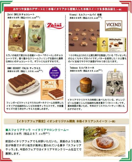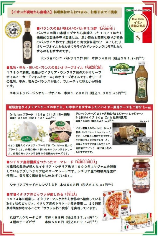 イオンは10月30日(水)~11月4日(月)までの6日間※2)、全国の「イオン」「イオンスタイル」「マックスバリュ」など、グループ14社・約1,040店舗※3)にて、「イタリアフェア」を開催します。
