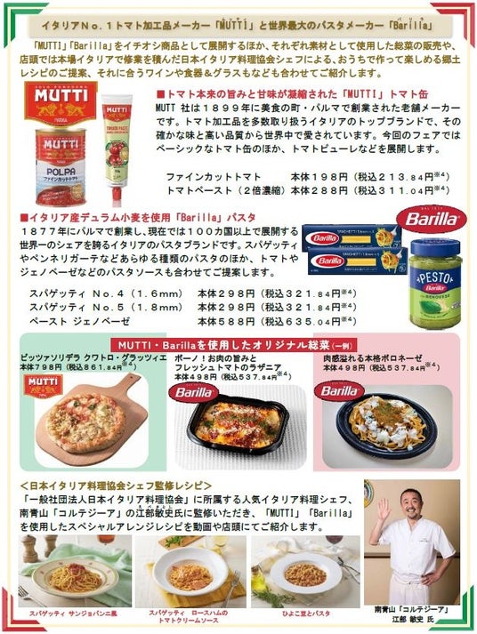 「MUTTI」と「Barilla」をイチオシ商品としてご提案します。「MUTTI」「Barilla」をそれぞれ素材として使用した総菜の販売のほか、店頭では本場イタリアで修業を積んだ日本イタリア料理協会シェフによる、おうちでつくって楽しめる郷土レシピや、それに合うワインや食器なども合わせてご紹介し、ご家庭で味わえる本格イタリア料理をご提案します。