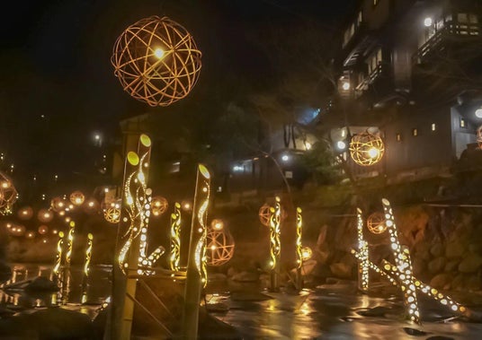 毎年12月下旬から期間限定で、「湯あかり」というライトアップイベントが行われています。地域の環境を守るために竹の間伐・再生活動の一環として始まり、温泉街を流れる川に、竹で作った灯篭を設置し明かりを灯します。黒川温泉の冬の風物詩となっています。