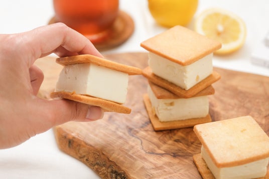 背徳感おやつ 極厚チーズケーキサンド レアチーズ~幸せずっしり。レアチーズの祝福~バター香る手のひらサイズのクッキーに、厚めのレアチーズケーキをサンドした、見た目も味も大満足の贅沢おやつです。