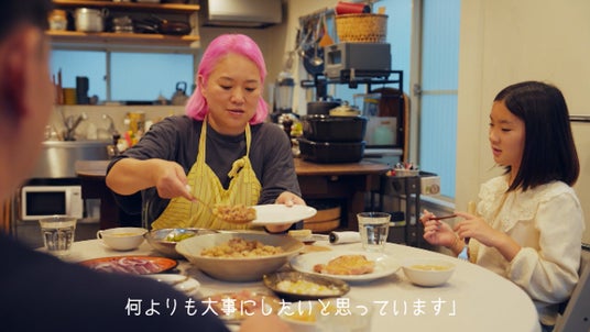 料理家、経営者、大学生、そして母として、忙しい日々を過ごす栗原さんの姿が映し出されます。そして、家族で食事をするシーンでは「これからもいろんなことをやっていきたいです。でも家族と一緒に美味しいものを食べる時間を何よりも大事にしたい」と、栗原さん自身の声が重なります。自分のやりたいことに前向きに取り組みながらも、家族との時間を大切にする。そんな栗原さんの想いが伝わるエモーショナルなCMです。