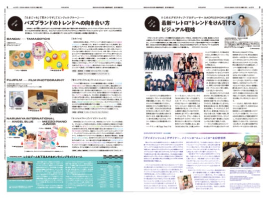 特集は、まず渋谷や原宿でキャッチした“レトロ”スタイルの若者たちのスナップや、Z世代の三人を招いた座談会を通してトレンドを享受する当事者の心理に迫ります。さらに、平成に社会現象を巻き起こし、現在人気再沸騰中の「たまごっち」を手がけるバンダイや、「エンジェル・ブルー」や「メゾピアノ」がリバイバル中のナルミヤ・インターナショナルに、“レトロトレンド”に対してどんな施策を講じているのか聞き取りをしたほか、斬新なレトロスタイルを提示し続けるXGのエグゼクティブプロデューサー、JAKOPS(SIMON)さんに若者たちを虜にするビジュアル戦略を聞きました。また、44年間ストリートスナップを撮り続けるアクロス編集部や、消費者行動論を専門に研究する国士舘大学の水師裕准教授には、識者の観点から現在のレトロトレンドの傾向や、その消費のメカニズムを解説していただいています。