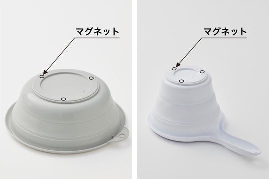他社メーカー様でもマグネット付きの湯おけ・手おけはありますが、弊社独自の特徴は“折りたためる”点にあります。