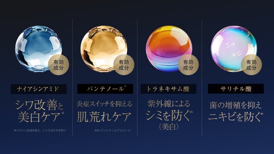 4つの有効成分(ナイアシンアミド・トラネキサム酸・パンテノール・サリチル酸)を一つの美容液に配合。多くの大人が抱える肌悩みに対し、全方位ケアを実現。肌悩みそのものが起こらないことを目指し、今ある悩みの改善だけでなく将来の肌悩みが起きにくくする、改善と予防のWケア。
