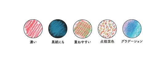 やわらかい芯を搭載することで、しっとりとした描き心地を実現していることに加え、筆記した際に紙面にしっかりと色がのることで、色濃くはっきりと発色することが特長となっております。さらに、一般的な学用品の色鉛筆の芯は直径3.0mmですが、これと比較して太くやわらかい直径4.0mmの芯を採用しているため、広い面をムラなく塗ることにも適しています。