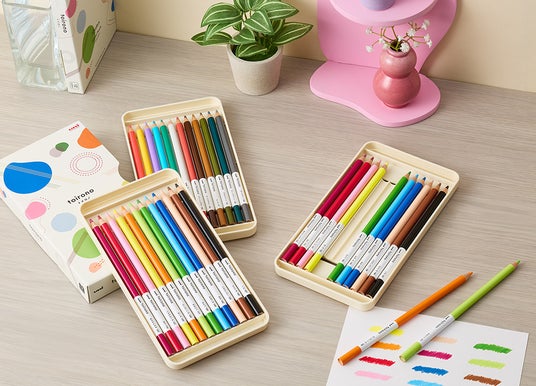 色鉛筆は、多彩な色展開を持ち、芯の削り方や持ち方、そして筆圧によって描線の太さや色の濃さなどを自由に調整できる特徴を持つアイテムです。『toirono(トイロノ)』は、太くやわらかい芯を採用することによって、従来の色鉛筆よりも濃淡やグラデーション、重ね塗りがしやすく、濃い色の上からでも発色よく描けるように設計されています。さらに、色相、明度、彩度についての説明書きを付属しており、日常的に描くことに親しみがない方でも、多彩な表現を楽しむことができます。表現の幅が広がることで、より豊かな発想やアイデアを引き出し、描く楽しさが一層増すことが期待されます。未就学のお子様から大人まで、色を使った表現を気軽に楽しめる、ワクワクするような新しい色鉛筆として、多くの方にご愛用いただける商品となっております。