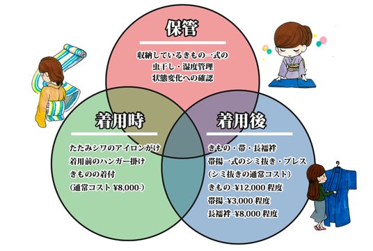 いつでもきものを着用出来る適切な湿度による保管と定期的な虫干し、さらに着用前のたたみシワ伸ばしのアイロン掛け・着物の着付と着用後のしみぬきを提供し、ストレスフリーなきものライフを提供します。着用機会のある方はもちろんですが、想いで深い逸品を大切にしたい方、きものは着たいけどお手入れが面倒とお感じの方に新設した独自のサービスです。