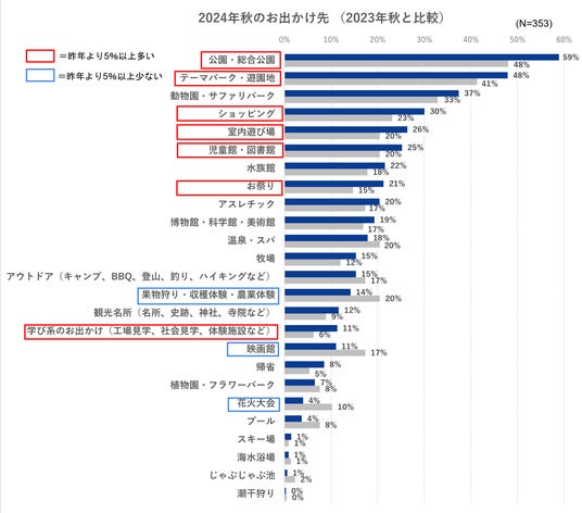 さらには、「ショッピング」「室内遊び場」「児童館・図書館」「お祭り」「学び系のお出かけ」も昨年より増加。一方で、「果物狩り・収穫体験」「映画館」などは昨年より減少していました。