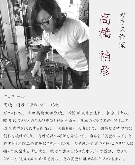 ひとつひとつ手作りで仕上げた逸品このワインのコップ。「質感マニア」という高橋氏が、型を使わない、重力と遠心力を巧みに操って成型する「宙吹き」という技法ならではの質感にこだわった作品です。工業製品にはない、見た目にもキレイでつるんとした気持ちのいい質感と上品なフォルムが特徴です。