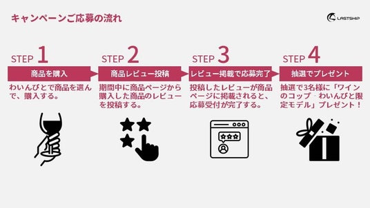 日本ワインの文化振興・販売促進事業を展開する株式会社LASTSHIP(本社:広島県広島市、代表取締役社長:山下武、以下、LASTSHIP)が運営する日本ワイン専門のモール型ECプラットフォーム「わいんびと」(以下、わいんびと)は、わいんびとユーザー登録者を対象に、商品レビュー投稿・掲載で「ワインのコップ – わいんびと限定モデル」をプレゼントするキャンペーン(以下、本キャンペーン)を実施します。