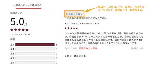 商品ページの「レビューを書く」ボタンをクリックすると、お客様がご購入いただいた商品のご感想や評価(★)を投稿することができます。商品レビューの投稿を行う場合は、その商品を1度でも購入している必要がございます。