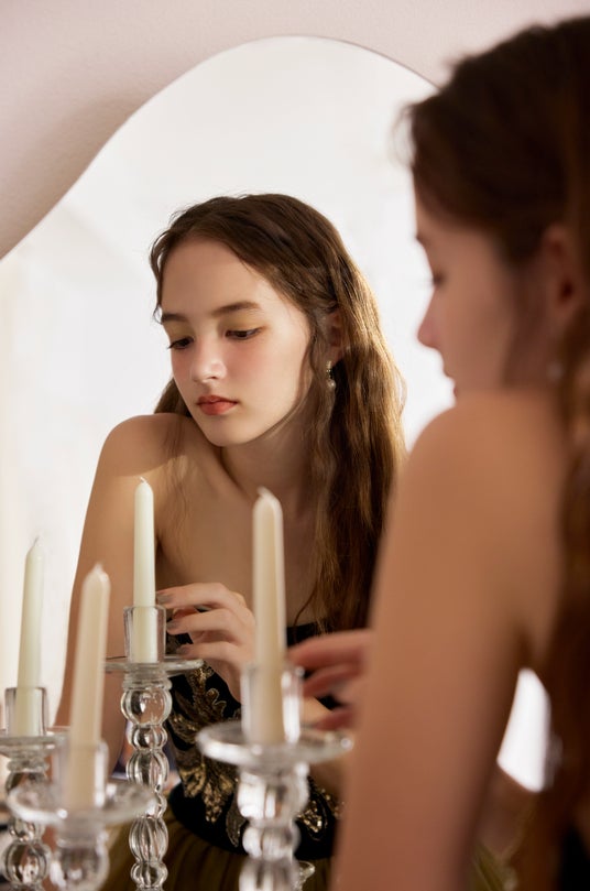アンティークテーブルにキャンドルを合わせた背景小物でオータムらしい温かみを演出。