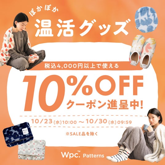 傘の国内売上トップシェアを誇る株式会社ワールドパーティー(本社:大阪市住吉区、代表取締役社長:冨田 智夫)が展開する傘ブランドWpc.(ダブリュピーシー)から誕生したテキスタイルデザインブランド「Wpc. Patterns(ダブリュピーシーパターンズ)」は、Wpc.公式オンラインショップで、Wpc. Patterns商品を含む、税込4,000円以上のご購入に使える10%OFFクーポンを配布する『ぽかぽか温活グッズ特集』を10月23日(水)10:00から10月30日(水)9:59までの期間で実施いたします。