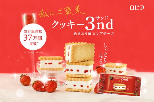 株式会社ロピアは11月1日(金)に、人気商品「クッキー3nd あまおう苺&レアチーズ」のリニューアル品を全国のスーパーマーケットやドラックストアにて発売します*。発売して3か月で累計販売実績は約37万個を突破し大変好評をいただいております。