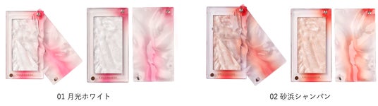 ジュエルのようなまばゆい輝きで惹きつけられる表情に魅せる月光ホワイトと、濡れたような光沢感を生み出し立体感のある表情に魅せる砂浜シャンパンの2色展開。