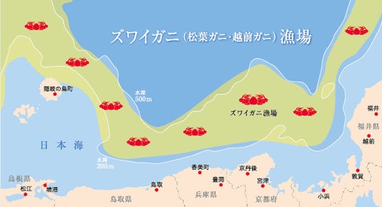 生まれも育ちも同じ山陰日本海沖および若狭湾の海域でありながら、ズワイガニは水揚げされる漁港によって「松葉ガニ」や「越前ガニ」などといったブランド蟹となりタグが付けられます。特定の漁港の名前が付けられることもあり、この呼称とタグにより、それぞれの地域のブランド蟹として流通します。
