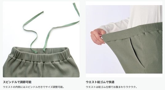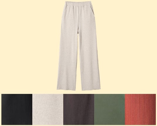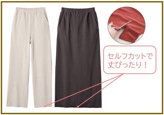左からセルフカットリブパンツ(カラー:ベージュ)、セルフカットリブスカート(カラー:チャコールブラウン)