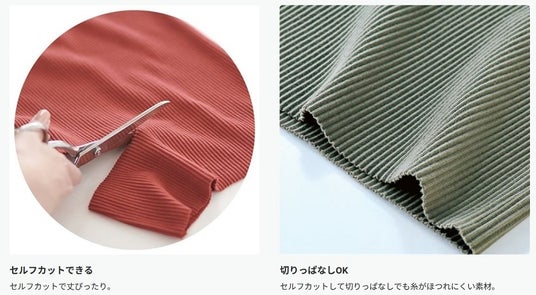ハサミで切るだけで自分好みの丈に設定でき、切りっぱなしでそのまま着用できる手軽さ。グ~ン!と伸縮性のあるストレッチ素材なので、窮屈感なく「ラク」な着用感に。シーズンレスに使え、綿混素材で程よい厚みもあり、体のラインを拾いにくくしました。