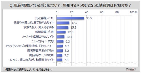 「テレビ番組・CM」が36.5%、「健康や栄養などに関するWebサイト」「家族や友人・知人のすすめ」「新聞記事・広告」「メーカーや店舗のWebサイト」が各10%台です。
