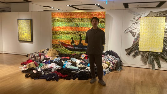 現在とは画材や作風の異なる路上画家時代の貴重な作品から現在のものまで、約150点ある展示作品の中から注目してほしいと語ったのは、2024年に制作した「Think Tank Of Freedom & Justice」。ガーナでは、先進国から寄付されたアパレル製品が無償で提供されるのではなく現地で販売され、その結果、在庫過多で手に負えなくなった業者が大量にビーチに投棄している、という実情を知りました。3人の少年の悲しげな姿とともに、長坂の当時の感情や思いをそのまま文字にして描いた力強い作品です。また投棄されたアパレル製品を買い取り、作品の一部とすることでその衝撃さを伝えています。