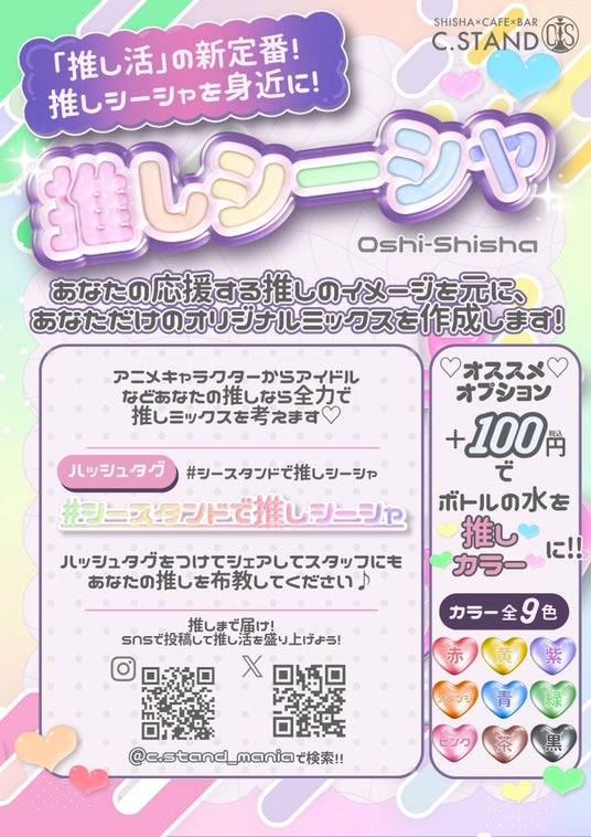 さらに話題の「推しシーシャ」サービスも実施中!スタッフに推しの特徴を伝えると、そのイメージを再現した特別なシーシャを提供します。さらに、+100円でボトルを推しカラーにカスタマイズすることも可能です。SNSでは「#シースタンドで推しシーシャ」を投稿して、推し活を全力で楽しんでください。