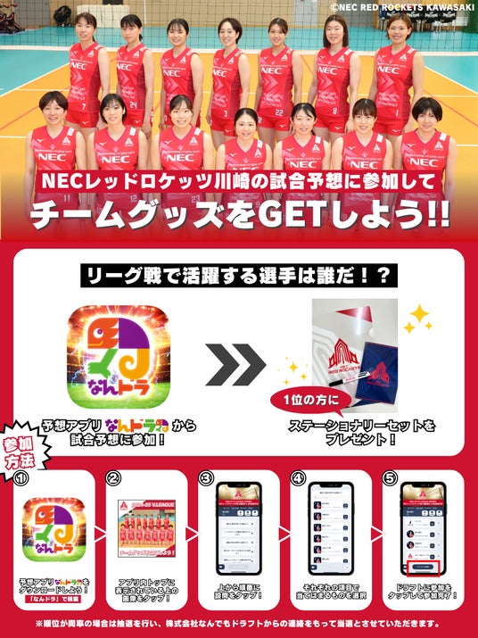 イノベーションの力で新たなスポーツ・エンターテインメントを創造し、まだ見ぬ感動と熱狂を提供するアプリ「なんドラ」を運営する株式会社なんでもドラフト(本社:東京渋谷区、代表:森井啓允)は、SVリーグ所属のNECレッドロケッツ川崎の10月26日(土)、27日(日)に開催される vs クインシーズ刈谷戦での活躍選手と試合展開の予想を開催します。