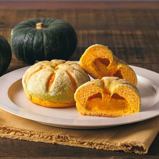 2つの生地で丸くてかわいい見た目に仕立て、風味豊かなかぼちゃあんでしっかりとしたかぼちゃ味も楽しめるかぼちゃのメロンパンです。