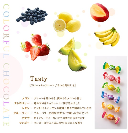 メロン・ストロベリー・ブルーベリー・マンゴー・バナナ・レモン、6種類の味が楽しめるカラフルなひとくちサイズのチョコレートを詰め合わせました。果汁をパウダー状(バナナを除く)に、果肉をフレーク状(バナナのみ)に加工してチョコレートに練り込み、フルーツの風味豊かに仕上げました。