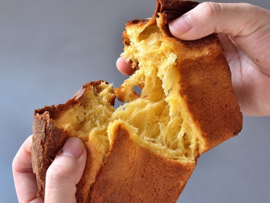 生ドーナツの生地であるアマムダコタン自慢のブリオッシュ生地を1年以上かけて改良。卵をたっぷりと使用することが特徴のブリオッシュ生地は、コクのある味わいと引き換えにパサつきが増してしまいますが、粉の配合や発酵時間、焼き時間や温度を細かく調整することで、これまでにない食感を再現することに成功しました。割ろうとすると指が沈んでしまうくらいの「生」を超えるふわふわ新食感、また他にはない「珍しい」ということから、『レア食パン』と名付けました。