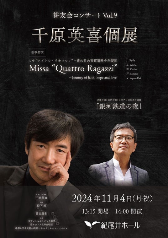 2022年にICOTがタケミツメモリアルホールで開催した「松下 耕と世界-今を生きる作曲家の群像-」にて千原英喜に委嘱した“ Kyrie ”に、新たに4つの曲が追加された新作組曲である。いまから440年ほど前の1582年に渡欧した天正遣欧少年使節をテーマにした作品で、希望に満ち溢れ渡欧し、ローマ教皇に謁見するなど大歓迎を受けたものの、帰国した彼らを待っていたのは、キリシタン迫害の現実だったという哀しい運命の物語が、ミサ形式の楽曲の中にドラマチックに描かれた超大作だ。東京メトロポリタン合唱団、総勢約70名のメンバーにて演奏される、壮大な無伴奏のア・カペラ作品となっている。またコンサートの開催地である紀尾井ホールは四谷の上智大学の横にあるため、都内でもキリスト教にとても縁の深いエリアであり、信仰に満ちた穏やかな空気の流れる場所でもある。