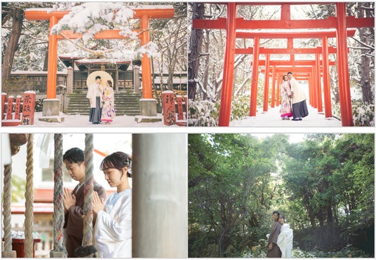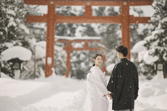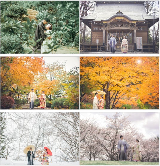 秋は紅葉、冬は一面の雪景色の中でフォトウェディングが叶います。