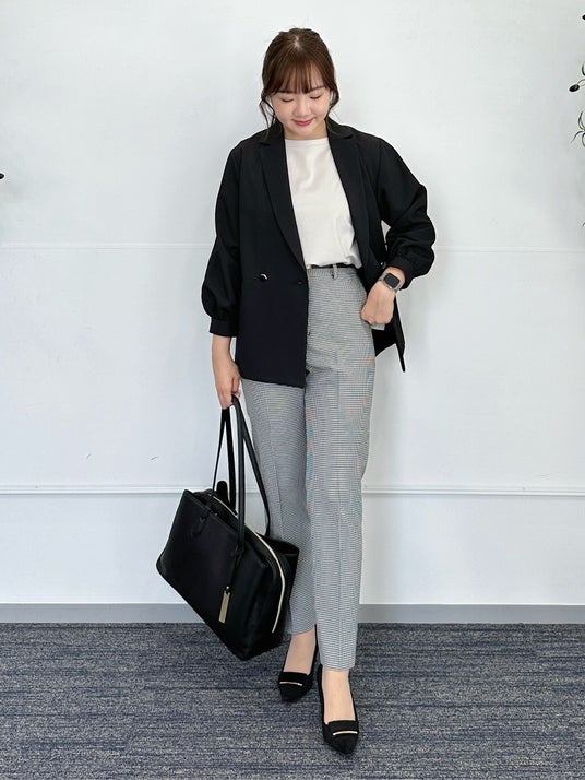 【Style1】 外回りもラクラク!“ストレッチ性抜群”なモノトーンを華やかにする「柄パンツ」コーディネート袖付けがゆったりしたドルマンスリーブは、きちんと感を保ちつつカジュアルな雰囲気を演出します。重くなりがちな秋冬のモノトーンコーディネートを華やかにするコツは、アクセントに“柄”を取り入れることです。ボトムに取り入れると派手な印象にもなりにくく、ビジネスシーンにもおすすめです。
