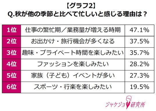 「秋の現代女性における生活実態調査」をしたところ、約60%の女性が「秋は他の季節と比べて忙しいと感じる」と回答しました(グラフ1)。忙しいと感じる理由として「仕事の繁忙期/業務量が増える時期」「お出かけ・旅行の機会が増える」「趣味・プライベートの時間を楽しみたい」が上位を占めました(グラフ2)。
