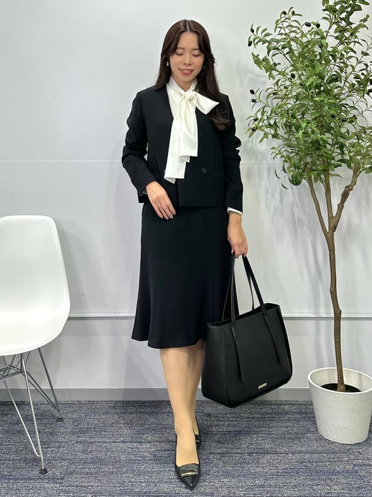 【Style3】 勝負の日も小さなこだわりを詰め込みたい!「ブラックセットアップ」コーディネート定番の黒のセットアップも、ジャケットをトレンドのショート丈にすることで、新鮮な印象を演出します。スカートとの相性も抜群です。大きなリボンタイが魅力的なブラウスで華やかさをプラス。ショート丈とリボンで視線が上がり、脚長効果も期待できます。