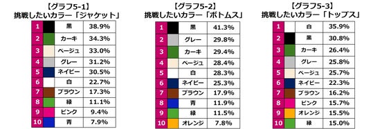 「秋のファッションに取り入れたいカラー」を「ジャケット」「ボトムス」「トップス」別で調査したところ、「黒」や「グレー」など、今秋冬トレンドのモノトーンや、「カーキ」など秋らしいカラーがランクインしました(グラフ5-1、5-2、5-3)。「ジャケット」に取り入れたいカラーを選んだ理由としては、「落ちついた印象がつくれる」「秋らしいカラーを取り入れたい」「定番カラーとして使いやすい」という声があがりました。秋も着まわし力のあるカラーに根強い人気が集まっています。