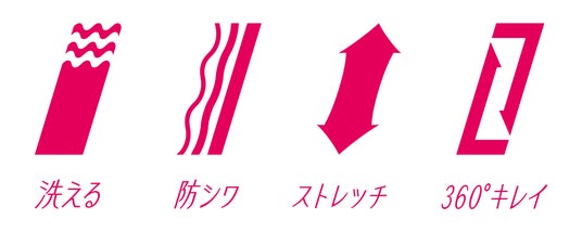 ご自宅の洗濯機で簡単にケア可能な「洗える」、アイロンの手間を軽減できる「防シワ」、生地の伸縮性が高く、快適にお召しいただける「ストレッチ」など、14の高機能性によって、服からラクと快適さを実現します。