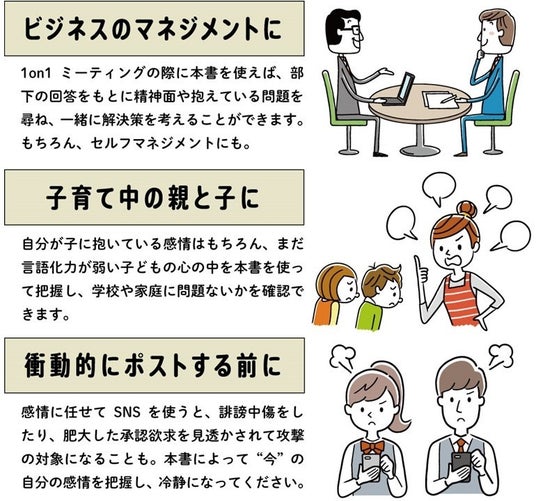 また、まだ自分の感情を言語化できない子どもに対して使うことで、正確な感情を把握して、適切なケアができるようになります。快適な毎日や幸せな人生を築く上で、ぜひ本書を活用し、感情をマネジメントするスキル、そして感情リテラシーを身につけてください。