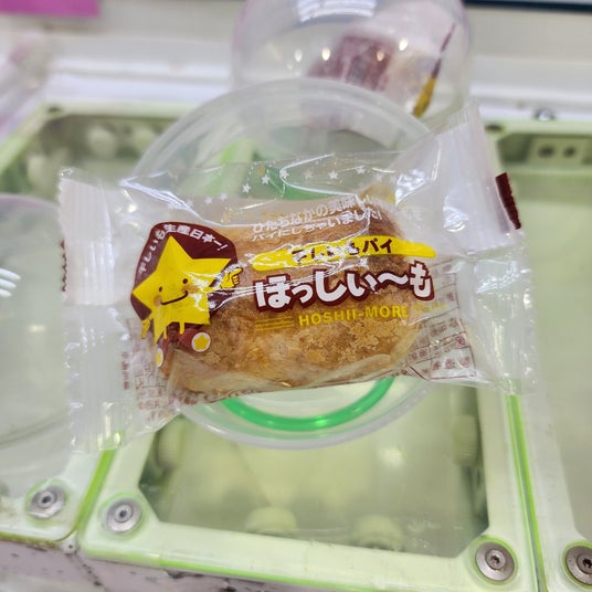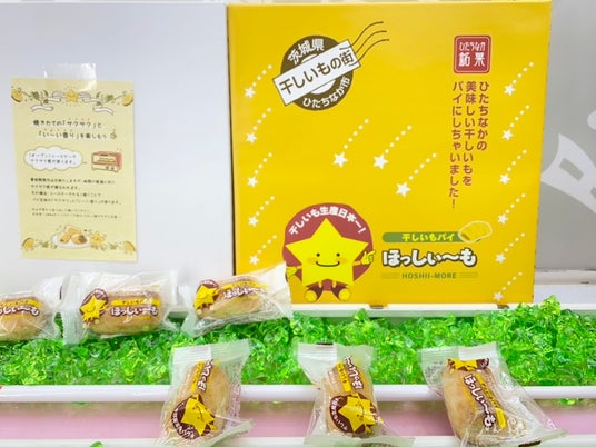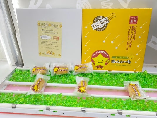 こちらのクレーンゲームには、茨城県のふるさと納税の返礼品に選ばれたり、旅行専門誌「じゃらん」にて、『絶対喜ばれる!茨城県のお土産25選!地元民「人気ランキング」&編集部おすすめ』で1位を獲得した茨城県を代表する商品で、「ひたちなかの美味しい干しいも」をパイにした商品【ほっしぃ~も】を景品に採用させて頂きました。