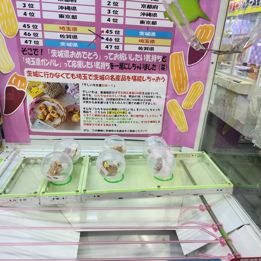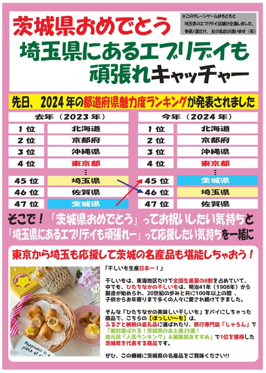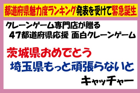 「笑顔創造」が企業理念の株式会社東洋(代表取締役:中村秀夫/本社:埼玉県北本市以下、当社)は、株式会社ブランド総合研究所(本社:東京都港区)より毎年発表されている『ブランド調査2024 “都道府県魅力度ランキング”』の結果発表を受けて、2012年に「1店舗あたりのクレーンゲーム設置台数が最多で世界初のギネス記録」に認定された『元祖・ギネス世界一のゲームセンター エブリデイ行田店(埼玉県行田市)』や、2019年に自社で保有していた「クレーンゲーム設置台数のギネス記録」を上回るクレーンゲーム設置台数でオープンした『 宇宙一!?のクレーンゲームセンター エブリデイとってき屋 東京本店 (埼玉県八潮市) 』などのクレーンゲーム専門店4店舗にて、【茨城県おめでとう埼玉県もっと頑張らないとキャッチャー(※)】が、期間限定で登場しました。
