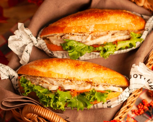 商品特徴:カリッと焼いたバゲットに、ごぼうサラダとキャロットラペ、蒸し鶏をたっぷり挟んだ、食べ応え抜群のサンド。秋の根菜を思いっきり楽しんでいただけます♪