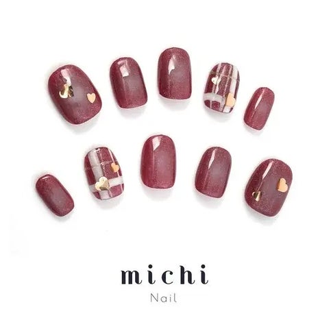 ブラウン味のあるボルドーのラメにほんのり白チーク、チェック、ゴールドのハートのホログラムが入った温かみのあるデザインです。