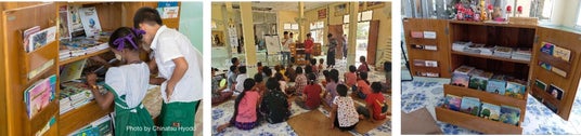 BAJでは、おもちゃ美術館との協働事業として、2016年1月より図書とおもちゃをセットにした本棚を100か所に寄贈する「Book&Toyライブラリー100プロジェクト」を開始しました。図書や遊具が乏しいミャンマーの子ども達に良質の学びの機会を提供することを目的におこなっています。その他、図書とおもちゃをセットにした「ミニ図書館」として、ミャンマーと外国の伝記や童話などの絵本のほか、図画や写真が豊富な図鑑や学習本、小説などで、好奇心を掻き立て、視覚的にも楽しめること、自国と海外の文化・情報が得られること、教科学習を補強する図書を届けています。