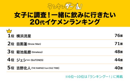 1位とわずか5票差で2位にランクインしたのは、目黒連さん。続く、3位の菊池風磨さん、4位のジェシーさん、5位の吉野北人さんも僅差で順位が決定しました。憧れの芸能人たちと飲む姿を想像し、投票者の皆様からは熱意あるコメントを頂きました!気になる6位から10位は記事全文でご紹介しています!