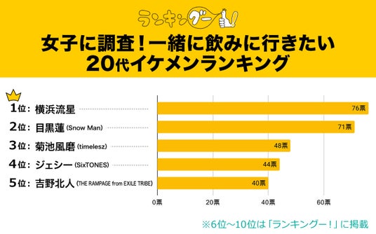 調査方法:株式会社CMサイトがインターネットリサーチした<女子に調査!一緒に飲みに行きたい20代イケメンランキング>のアンケート結果を集計。