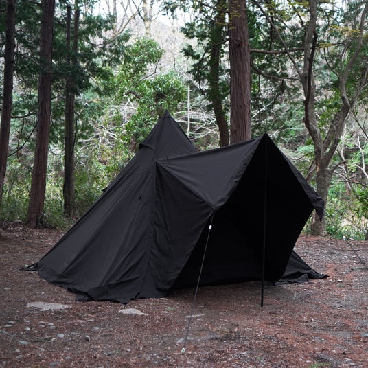 ブラックテントでも珍しいTC素材を採用したBLACK TIPI V2(ブラックティピーV2)は4点をペグダウンして設営できるワンポールテントです。